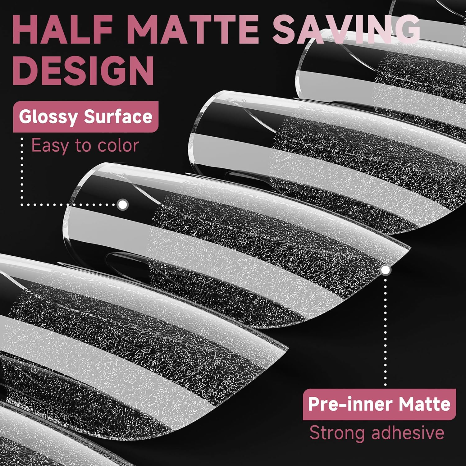 - HALF MATTE GEL NAIL TIPS-Our medium square nail tips pre-shape half matte saving design. no extra filing required! The clear square nails surface with a glossy finish for easier to color. The inner deep matte firmly adheres to the nail without worrying about the nail pop off easily. Easily get beauty that lasts 28+ days. We are committed to bringing you professional. efficient and safe nail care.